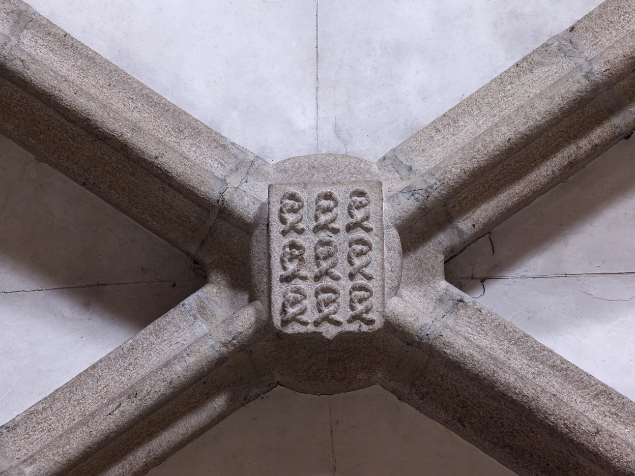 Minihy-Tréguier, rue de l'Église : église Saint-Yves, détail d'une clé de voûte armoriéeImmatriculation