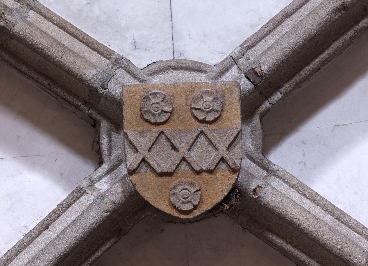 Minihy-Tréguier, rue de l'Église : église Saint-Yves, détail d'une clé de voûte armoriée. On peut identifier l'écu de Jean de Lantillac, l’archidiacre qui blasonne "d’argent à trois quintefeuilles de gueules, à la fasce de sable frettée d’or"Immatriculation