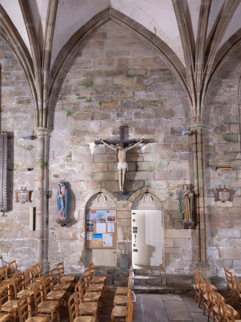 Minihy-Tréguier, rue de l'Église : église Saint-Yves, détail du mur nord, revers des deux portes. A signaler, la dissymétrie de la voûteImmatriculation