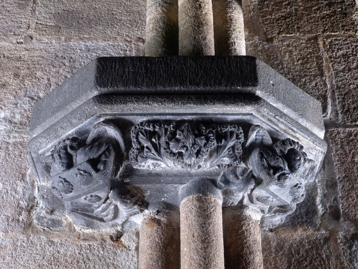 Minihy-Tréguier, rue de l'Église : église Saint-Yves, bénitier en tuffeau vert situé près de la porte de la chapellenie de saint Yves. Les armoiries sculptées à ses deux extrémités, peu visibles à moins de se baisser, ont échappé à l’inventaire de 1601, mais aussi à la vindicte révolutionnaire. Les armoiries présentées par des anges et qui se lisent "de sable à la fasce d’argent accompagné de trois coquilles de même" sont celles d’Yves Le Du, chapelain de l'église saint-Yves au milieu du 15e siècleImmatriculation