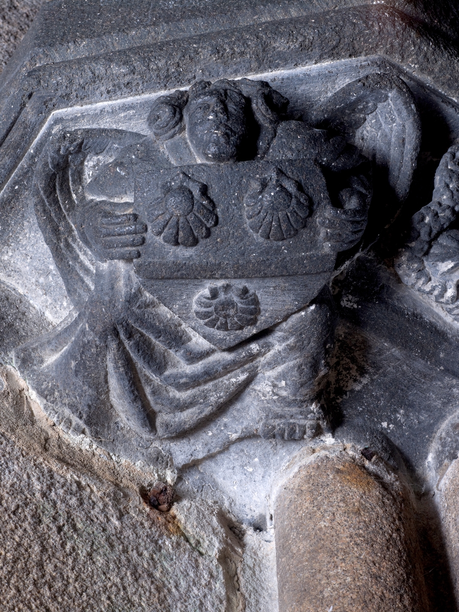 Minihy-Tréguier, rue de l'Église : église Saint-Yves, bénitier en tuffeau vert situé près de la porte de la chapellenie de saint Yves, détail des armoiries d’Yves Le Du, chapelain de l'église saint-Yves au milieu du 15e siècleImmatriculation