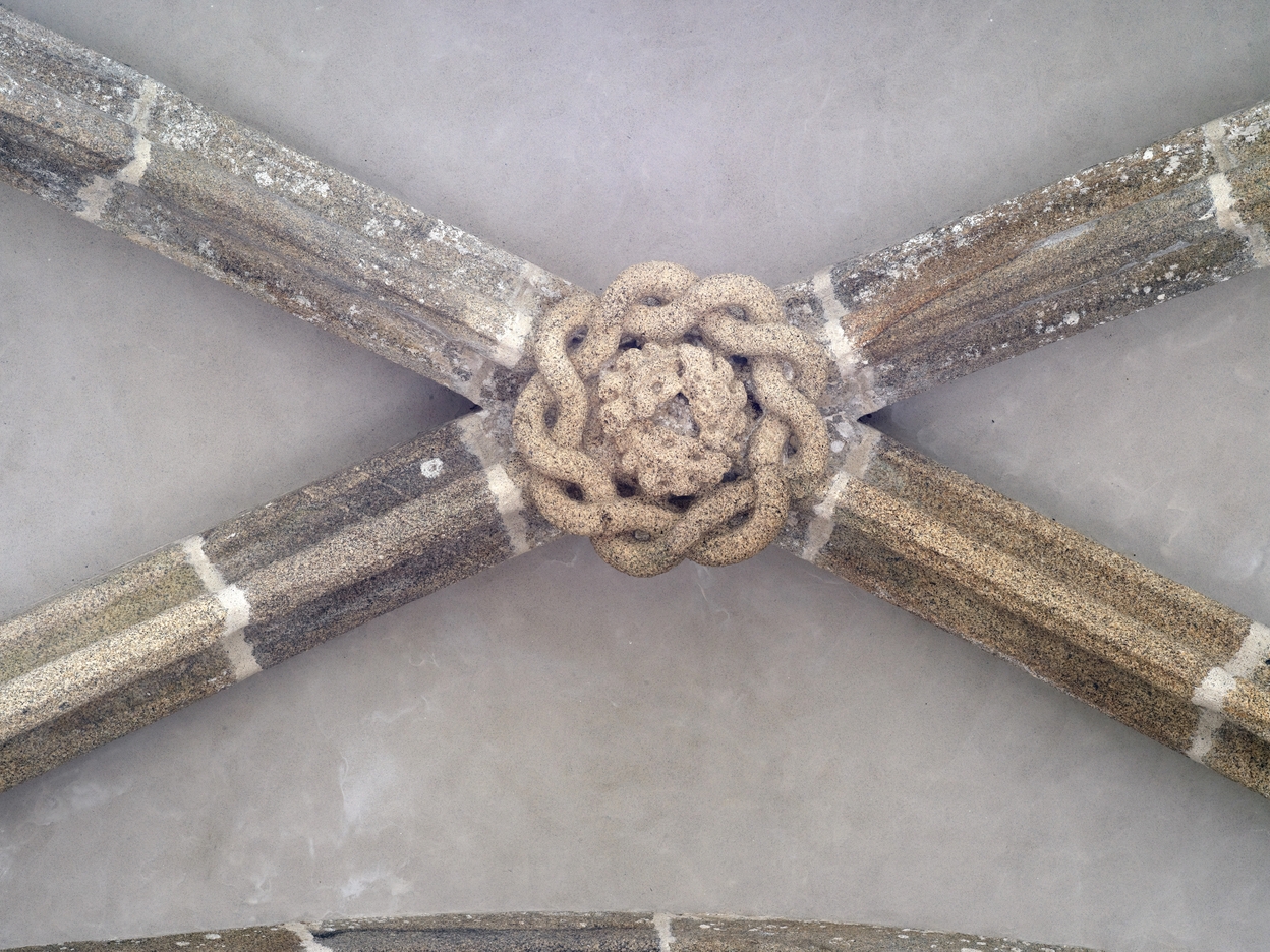 Minihy-Tréguier, rue de l'Église : église Saint-Yves, élévation nord, détail de l'intérieur du porche, clé de voûte ornéeImmatriculation