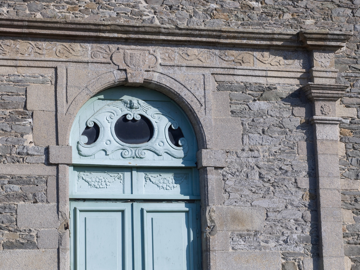 Tréguier : petit séminaire actuellement lycée Joseph Savina, aile nord, détail du portail - armorié - de la salle des conférences (remploi)Immatriculation