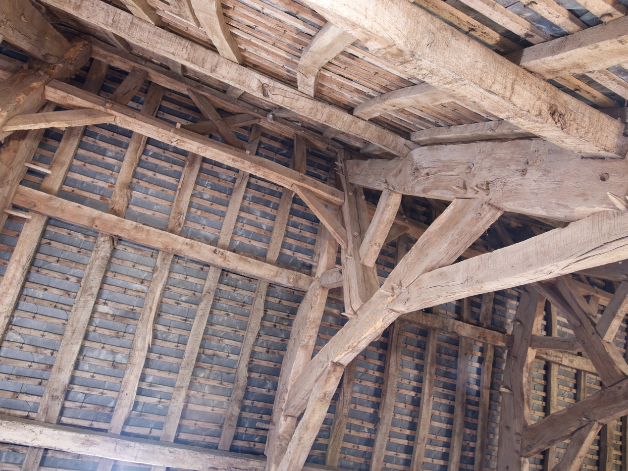 Logis principal. Combles. Détail d'une ferme à poinçon court, entrait retroussé et contrefichesImmatriculation