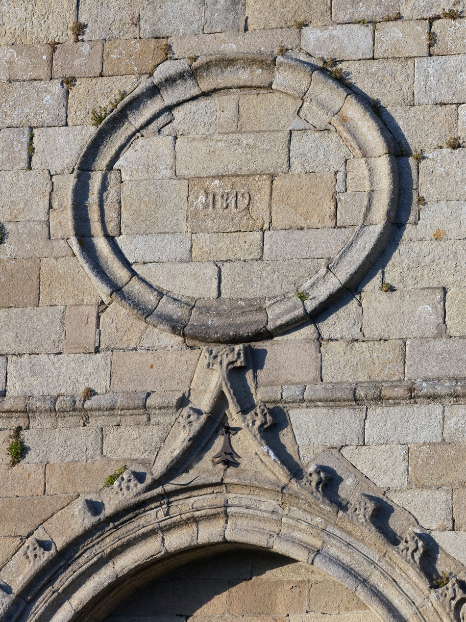 Minihy-Tréguier, rue de l'Église : église Saint-Yves, élévation ouest, détail du porche (millésime 1819)Immatriculation