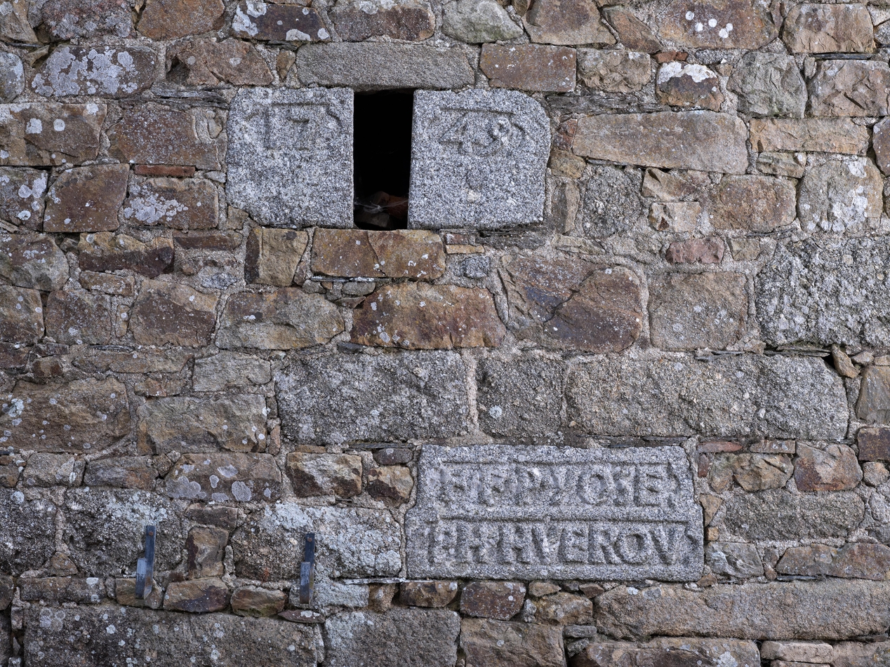Prat, Goaz an Floc'h : pignon d'une dépendance, millésime 1749 et inscription sur l'une des pierres "F:F:P: YOSEPH [Joseph] HVEROV [Huerou]"Immatriculation