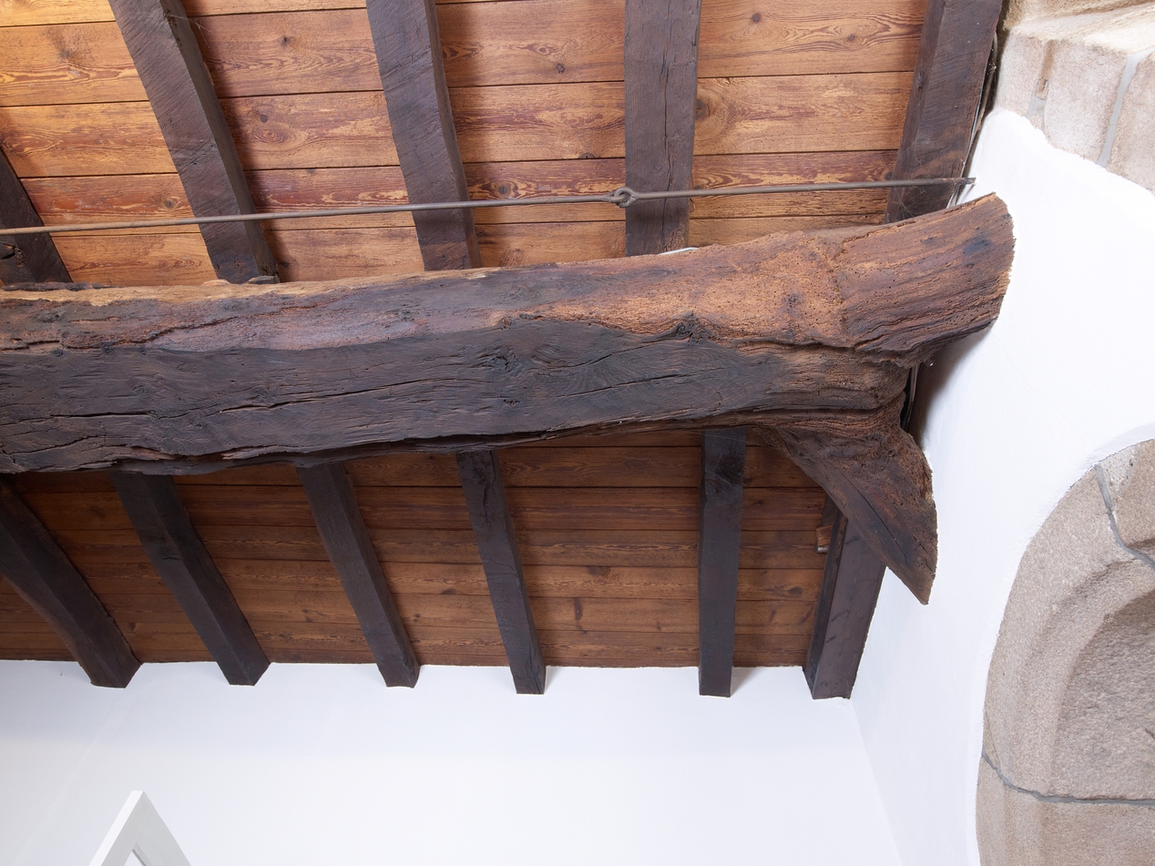 Rez-de-chaussée, cuisine (?) actuellement salle à manger, détail d'une poutre qui a gardé la forme d'origine de l'arbre...Immatriculation