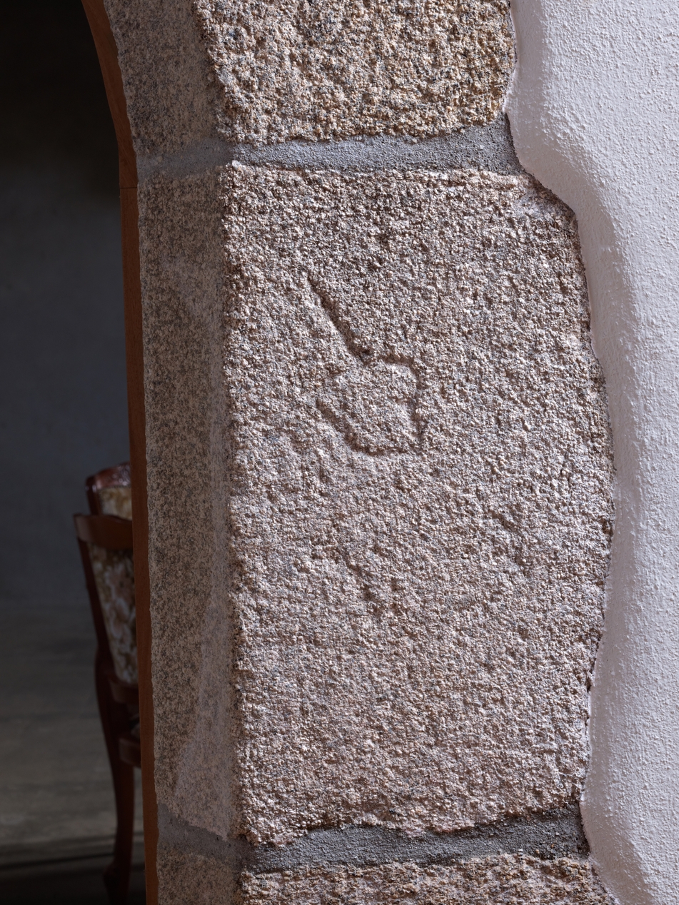 Rez-de-chaussée, salle basse actuellement vestibule, porte en arc plein cintre du mur de refend, détail des marques de tâcheronImmatriculation