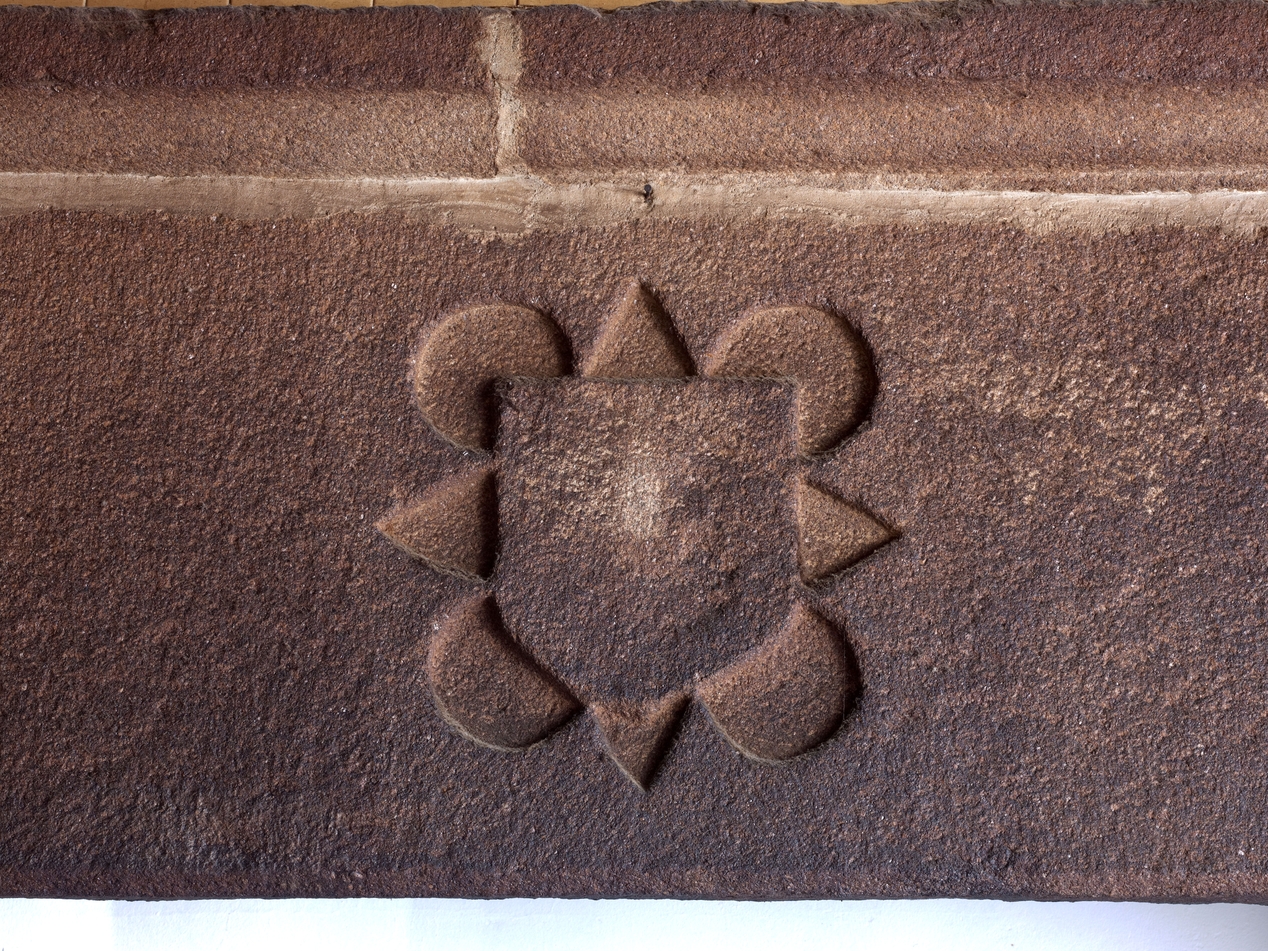 Minihy-Tréguier, Kerallic : ferme, logis principal, rez-de-chaussée, cheminée monumentale armoriée du mur de refend (ex pignon) situé entre les deux logis, détail du blason buchéImmatriculation
