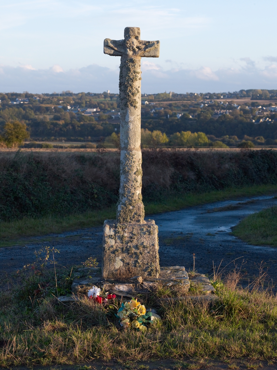 Minihy-Tréguier : croix de Coat Huel, face nord, Christ en croix. Socle daté de 1833 (?)Immatriculation