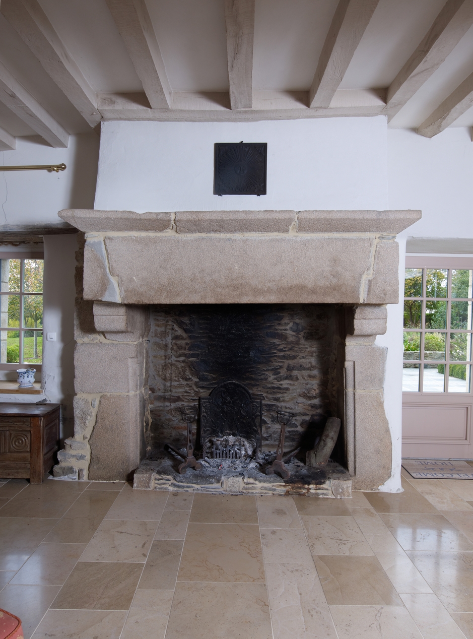 Rez-de-chaussée, salle basse sud, pignon sud, cheminée monumentale : piédroits, corbelets, scourges, manteau et corniche en graniteImmatriculation