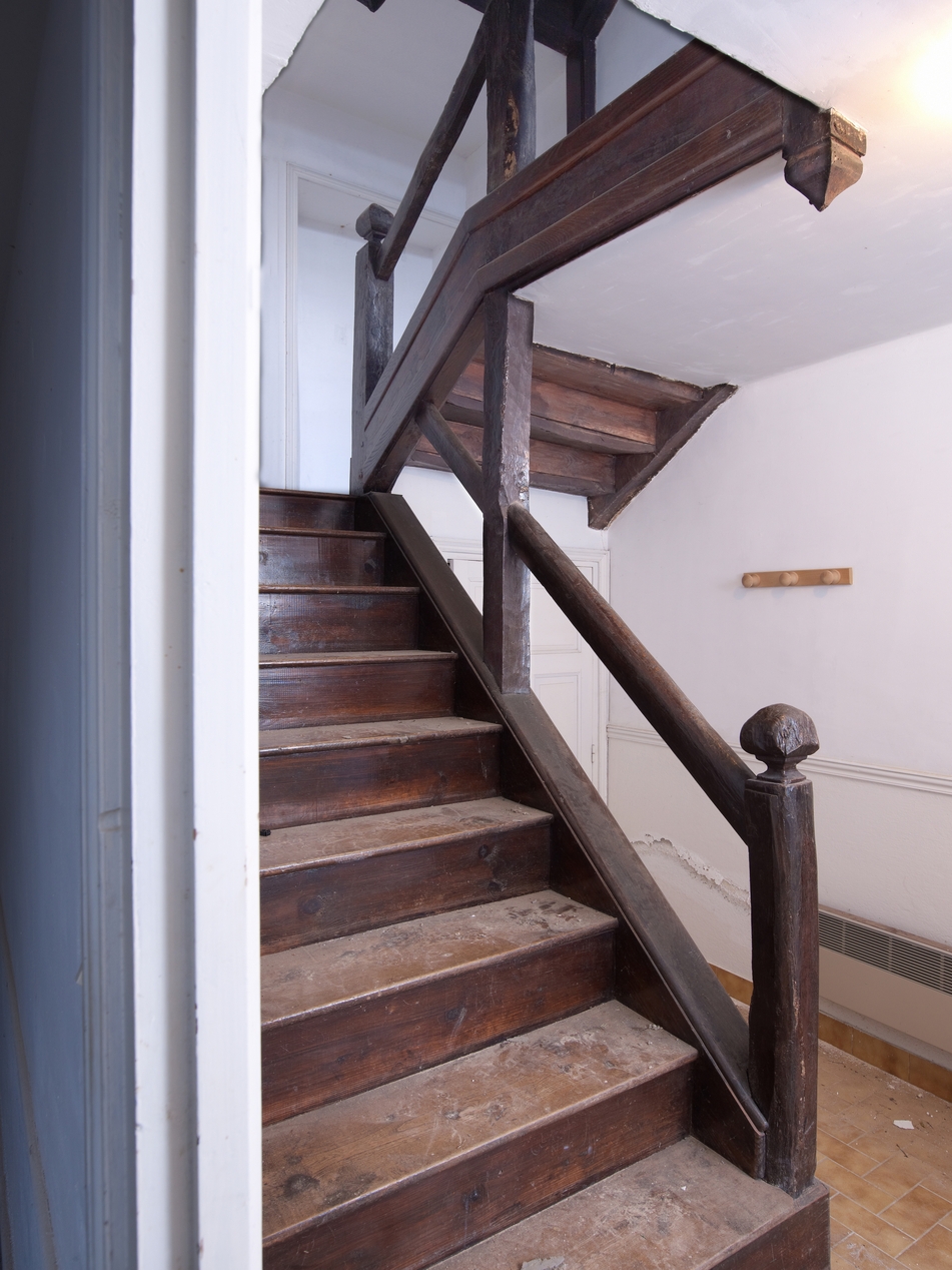 Minihy-Tréguier, 9 rue du Bourg : logis principal, détail de l'escalier tournant à rampeImmatriculation