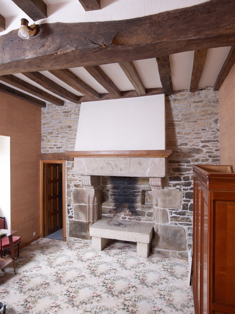 Minihy-Tréguier : manoir de Saint-Renaud, chambre basse orientée est-ouest, cheminée et porte étroite à linteau droit donnant sur la cuisineImmatriculation