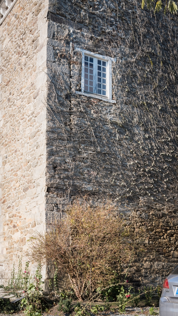 Détail de la façade est du château des ouvertures bpouchées et des linteaux en bois.Immatriculation
