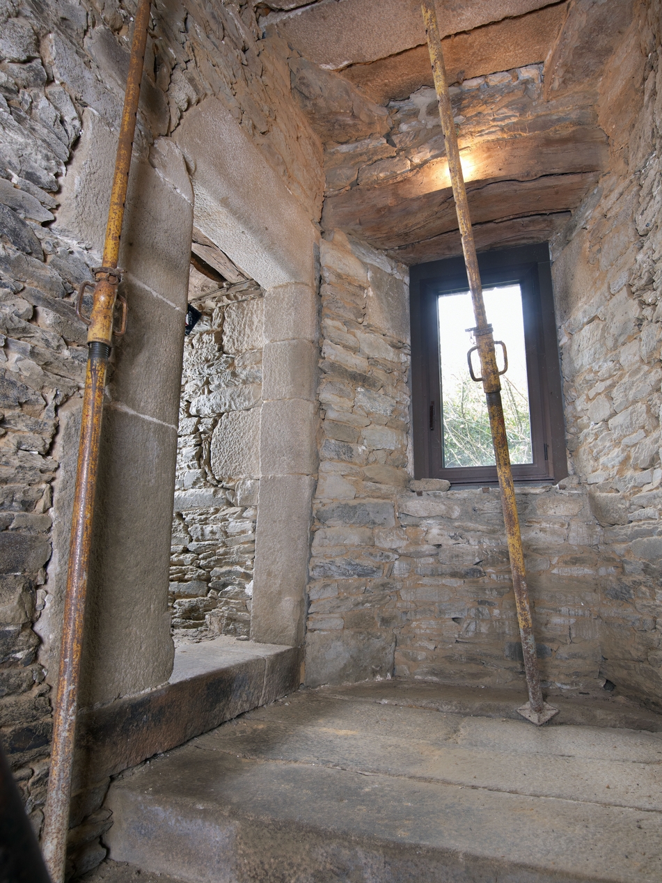 Minihy-Tréguier : manoir de Saint-Renaud, escalier rampe sur rampe, premier repos. L'originalité de cet escalier réside dans les paliers décrochés d’une marche : chaque volée de l’escalier pouvant ainsi être condamnée par une porteImmatriculation