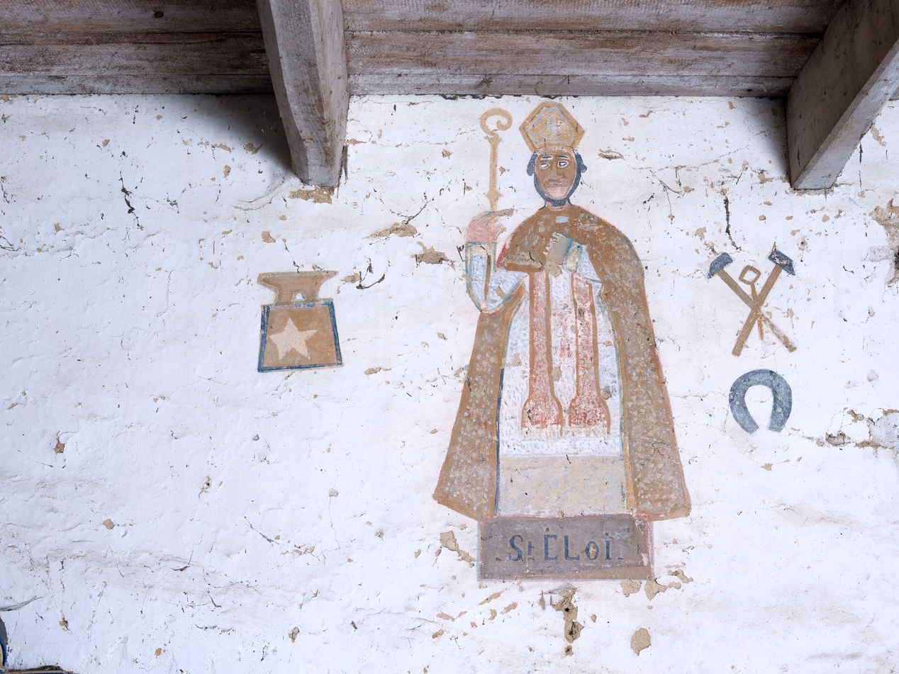Minihy-Tréguier, Crec'h an Goué : écurie, détail d'une peinture murale. Cette peinture représente saint Éloi, patron des maréchaux-ferrants avec ses attributs : mitre, crosse d'évêque, enclume, outils de forgeron, marteaux et tenailles, fer à chevalImmatriculation