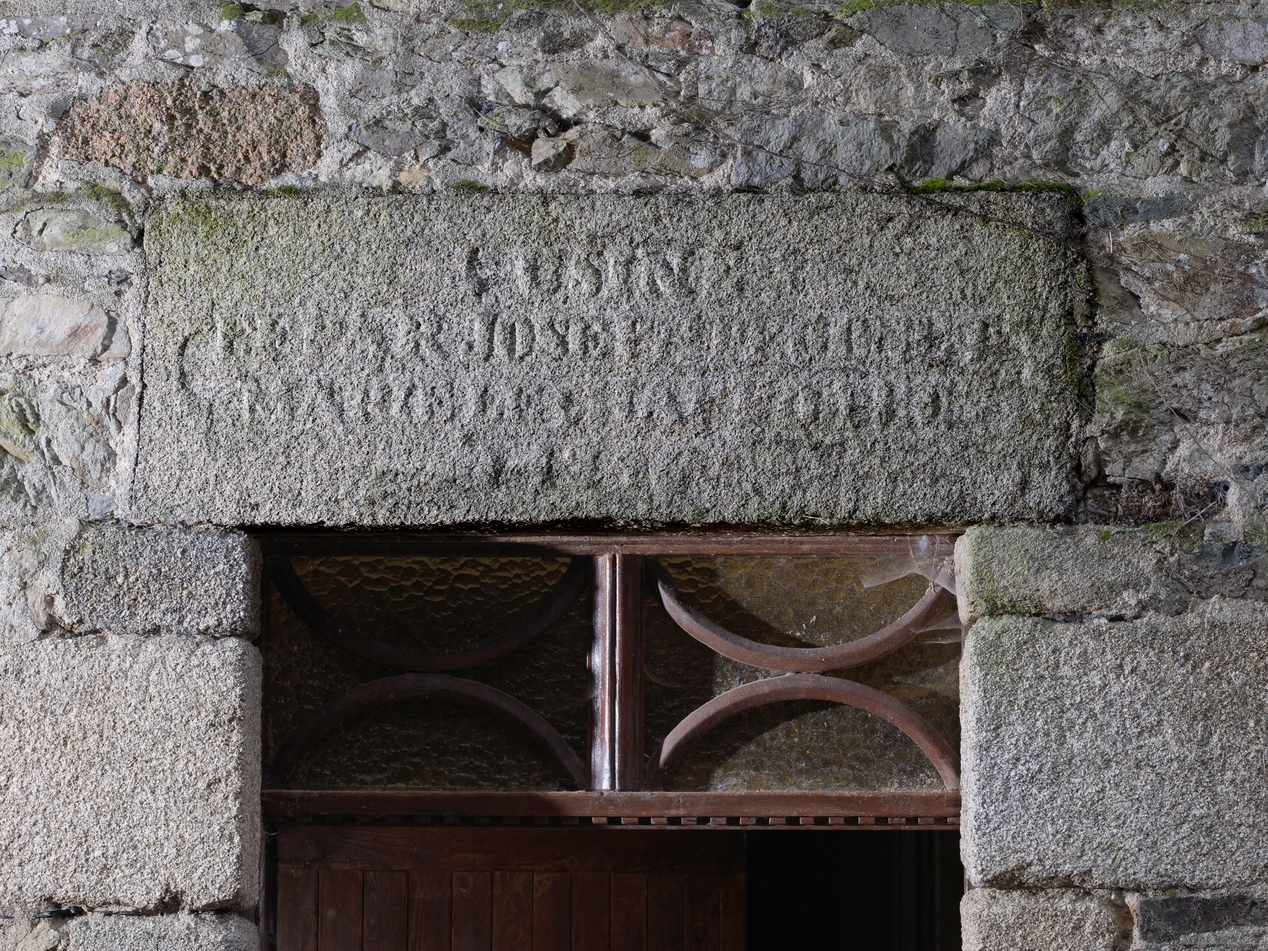 Minihy-Tréguier, le Guindy : moulin de Troguindy, élévation est, détail du linteau de la porte. On peut lire l'inscription et le millésime suivant : "USINE / F. F. PAR JOSEPH P-SSON ET / MARIE LE CHAFFOTEC / 1846"