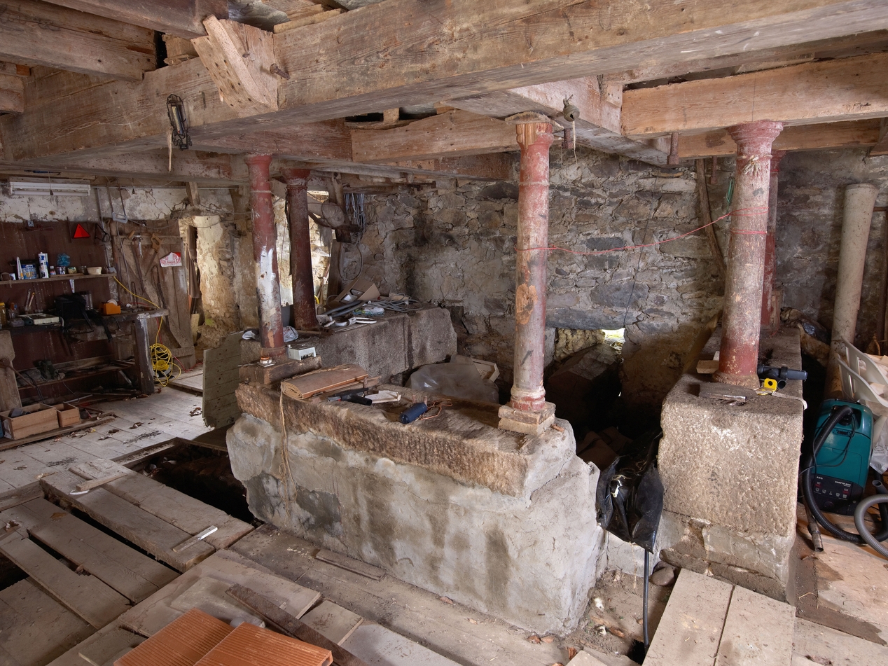 Minihy-Tréguier, le Guindy : moulin de Troguindy, vue intérieure, axe en bois de la roueImmatriculation
