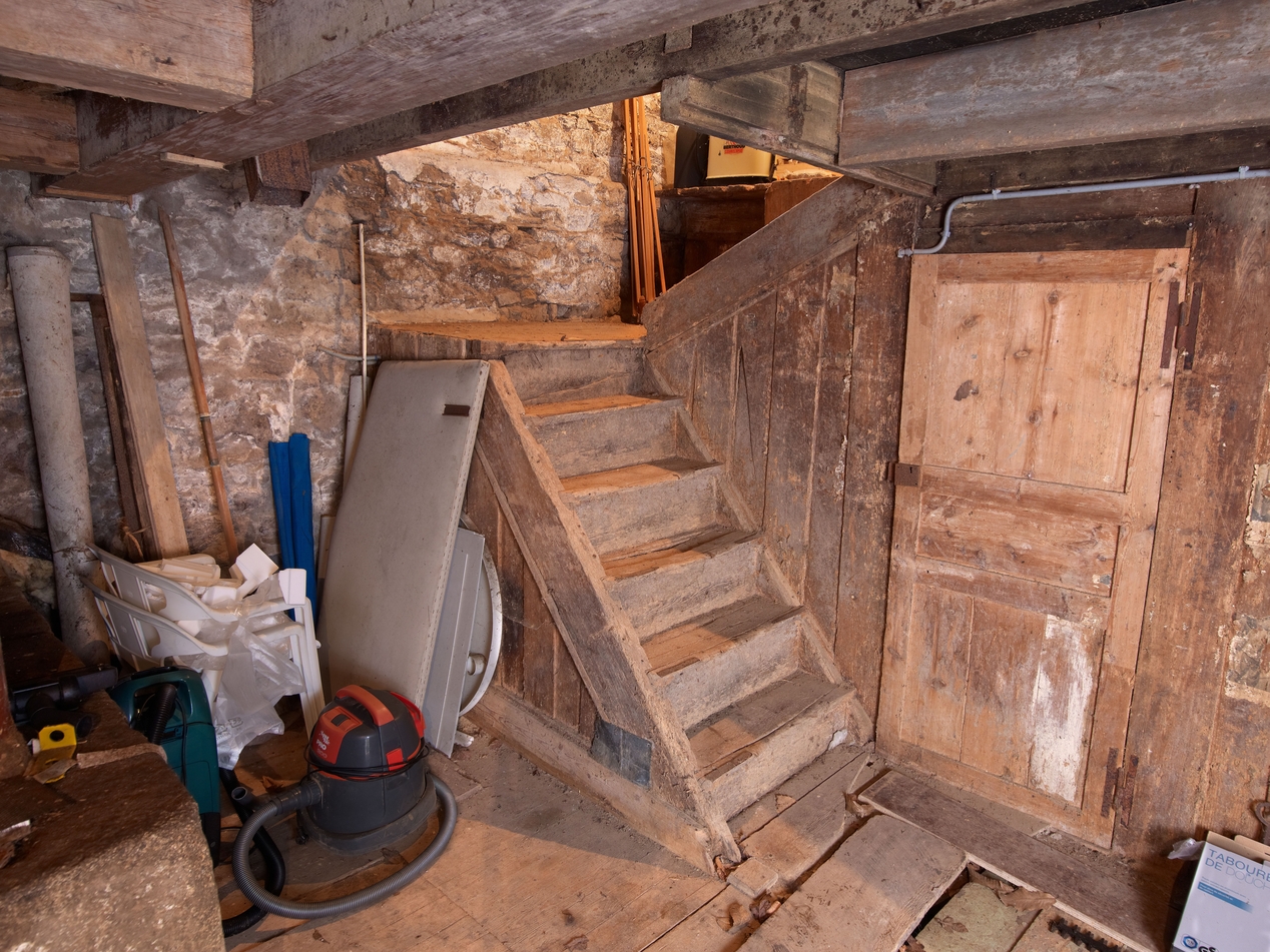 Minihy-Tréguier, le Guindy : moulin de Troguindy, vue intérieure, escalier et cloison en boisImmatriculation