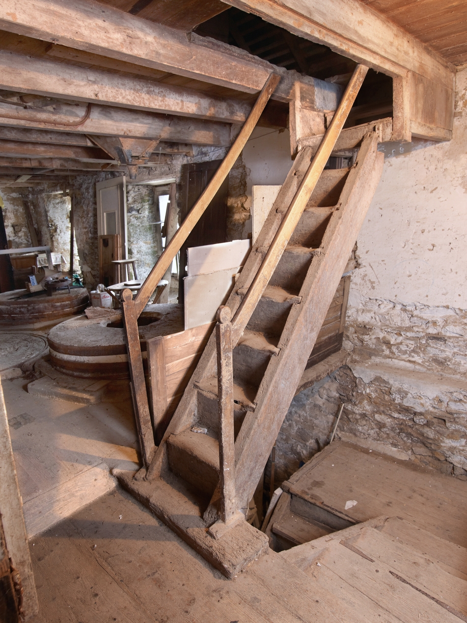 Minihy-Tréguier, le Guindy : moulin de Troguindy, vue intérieure, escalier menant à l'étage de combleImmatriculation