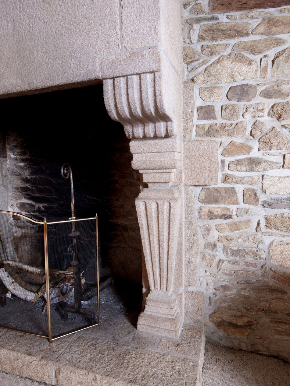 Tréguier, 12 rue Colvestre : maison à pan de bois, premier étage, salle haute sur rue avec cheminée armoriée, détail d'un des deux piédroits à pilastre en gaine fuselé (profil plus étroit de la base au sommet)Immatriculation