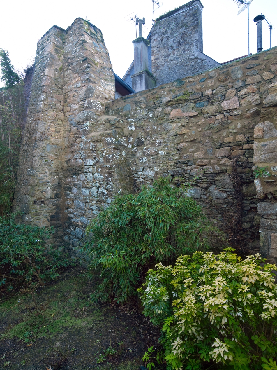 Tréguier, 12 rue Colvestre : détail du mur de clôture (on distingue des contreforts). Une "maison, bâtiment et cour" se dressait à cet emplacement en 1834Immatriculation