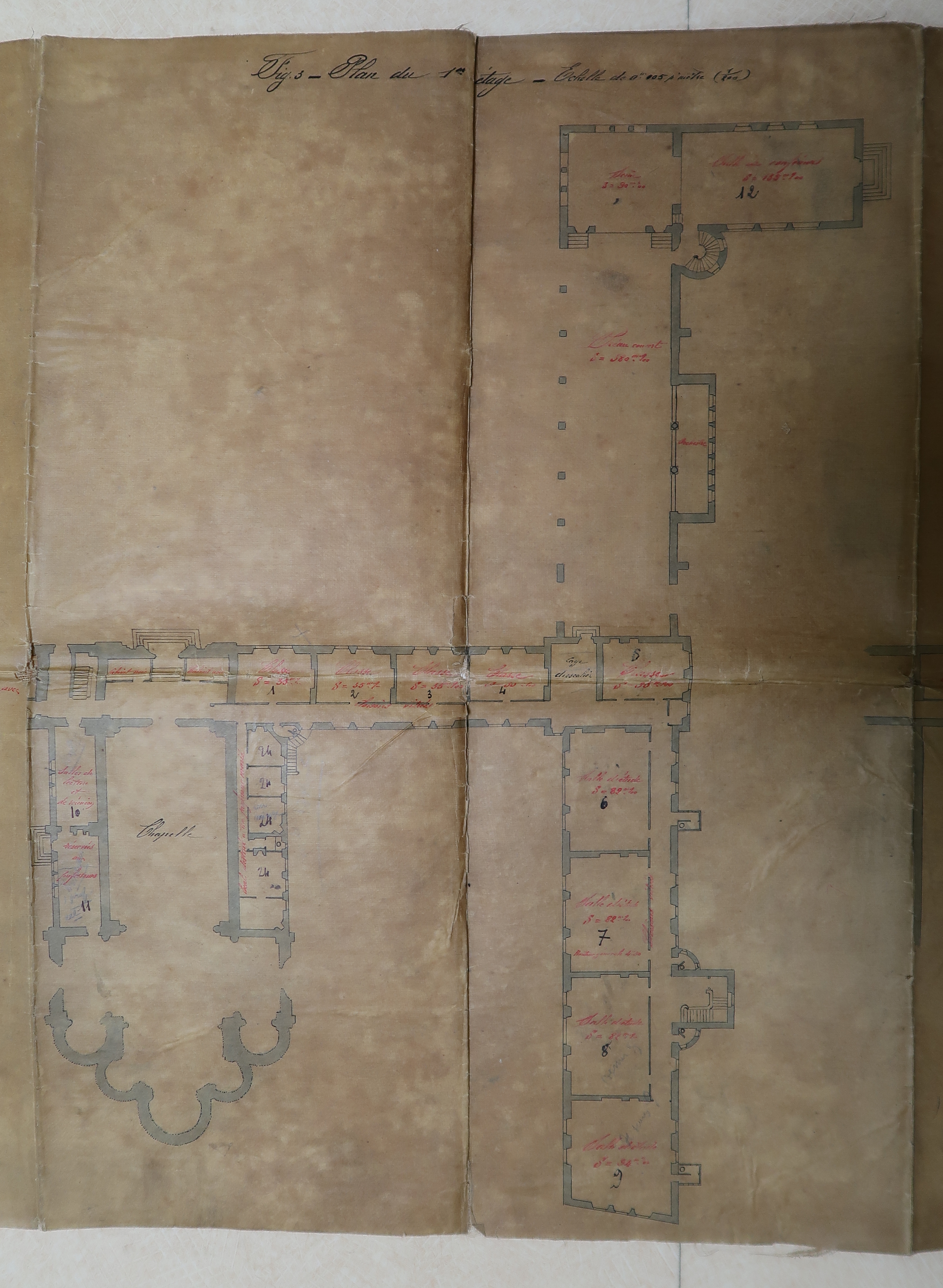 Tréguier : plan du projet de création de l'école primaire supérieure dans les locaux de l'ancien petit séminaire (plan du premier étage), 12 février 1908 (Archives municipales de Tréguier, 4M2)Immatriculation