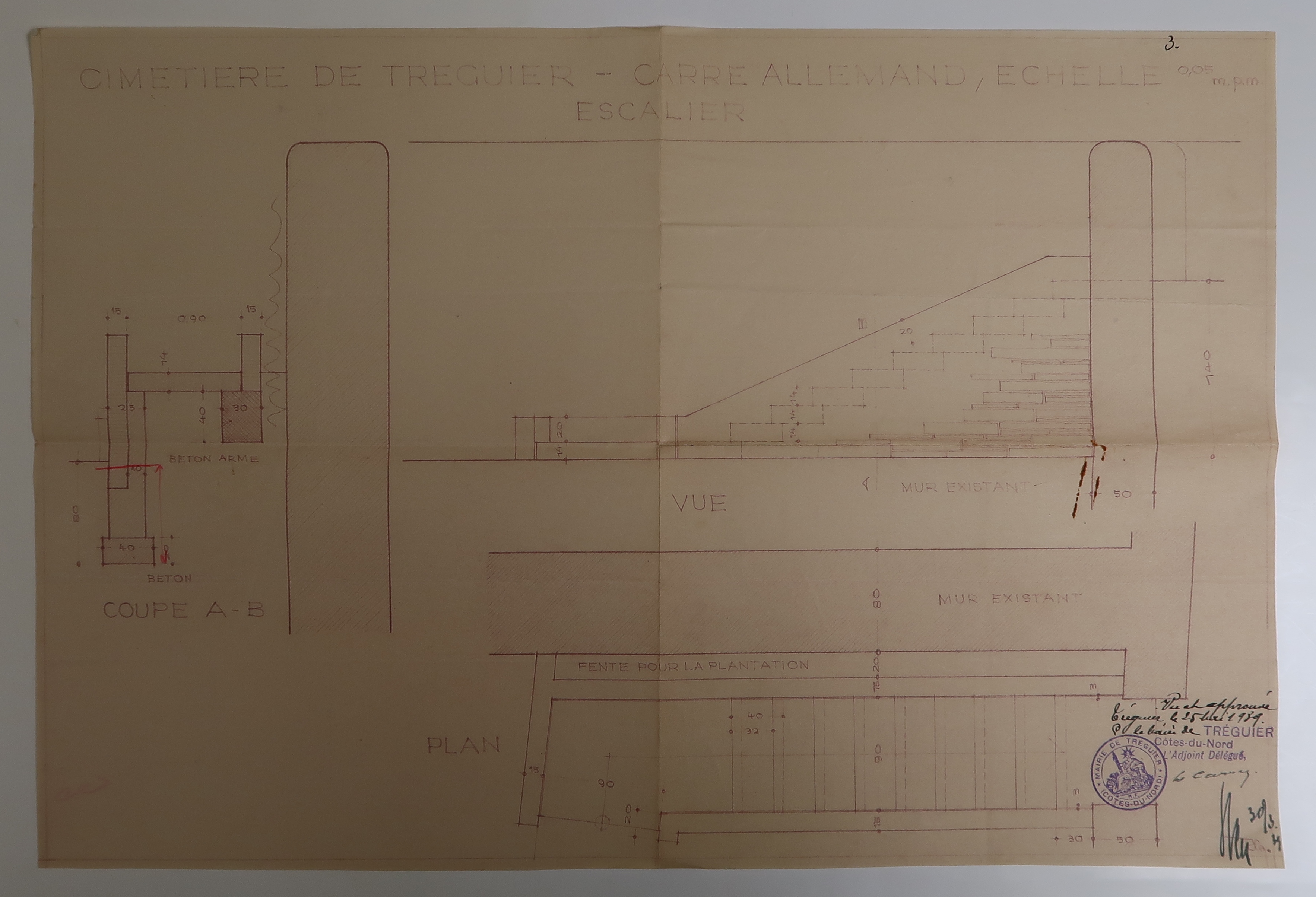 Tréguier, cimetière Saint-Fiacre et carrés militaires français et allemands : projet d'aménagement du carré militaire allemand (escalier), 25 mai 1939 (Archives municipales de Tréguier, 4H46)Immatriculation