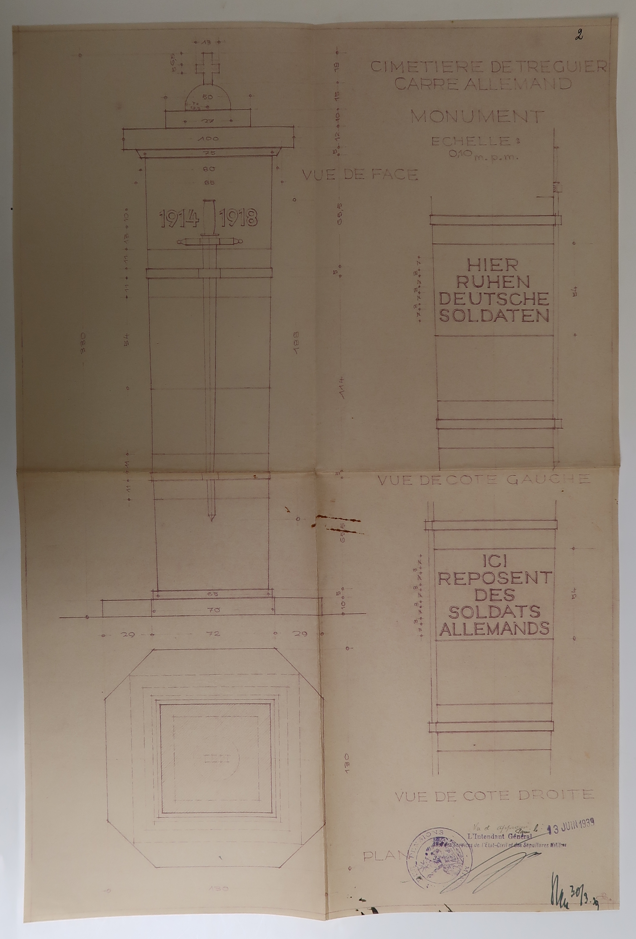 Tréguier, cimetière Saint-Fiacre et carrés militaires français et allemands : projet d'aménagement du carré militaire allemand (monument commémoratif), 25 mai 1939 (Archives municipales de Tréguier, 4H46)Immatriculation