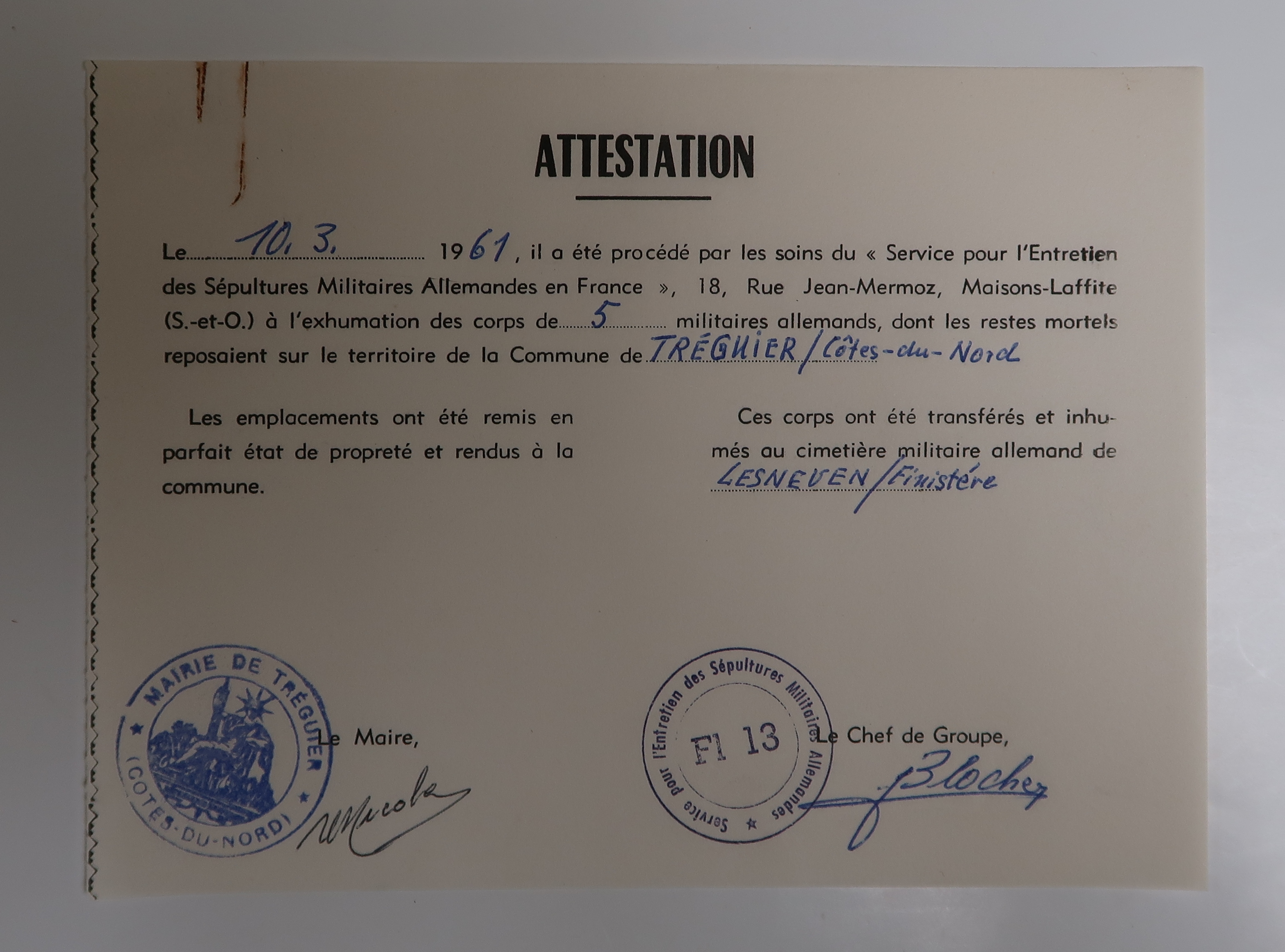 Tréguier, cimetière Saint-Fiacre et carrés militaires français et allemands : attestation d'exhumation des corps de 5 militaires allemands morts lors de la Seconde guerre mondiale et inhumés à Tréguier, 10 mars 1961 (Archives municipales de Tréguier, 4H43)Immatriculation