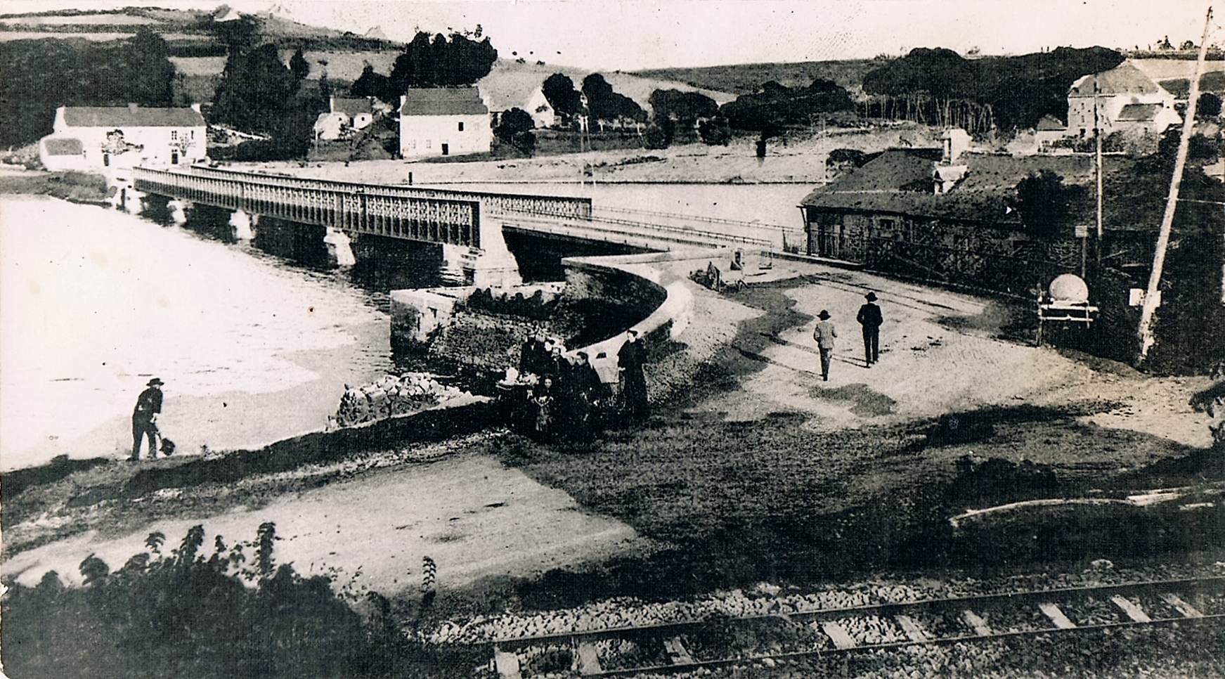 Tréguier : pont Canada (second pont routier de type « pont à poutre métallique disposé en treillis ») et son corps de garde côté Tréguier, carte postale (collection particulière). Au premier plan, une ligne de chemin de ferImmatriculation