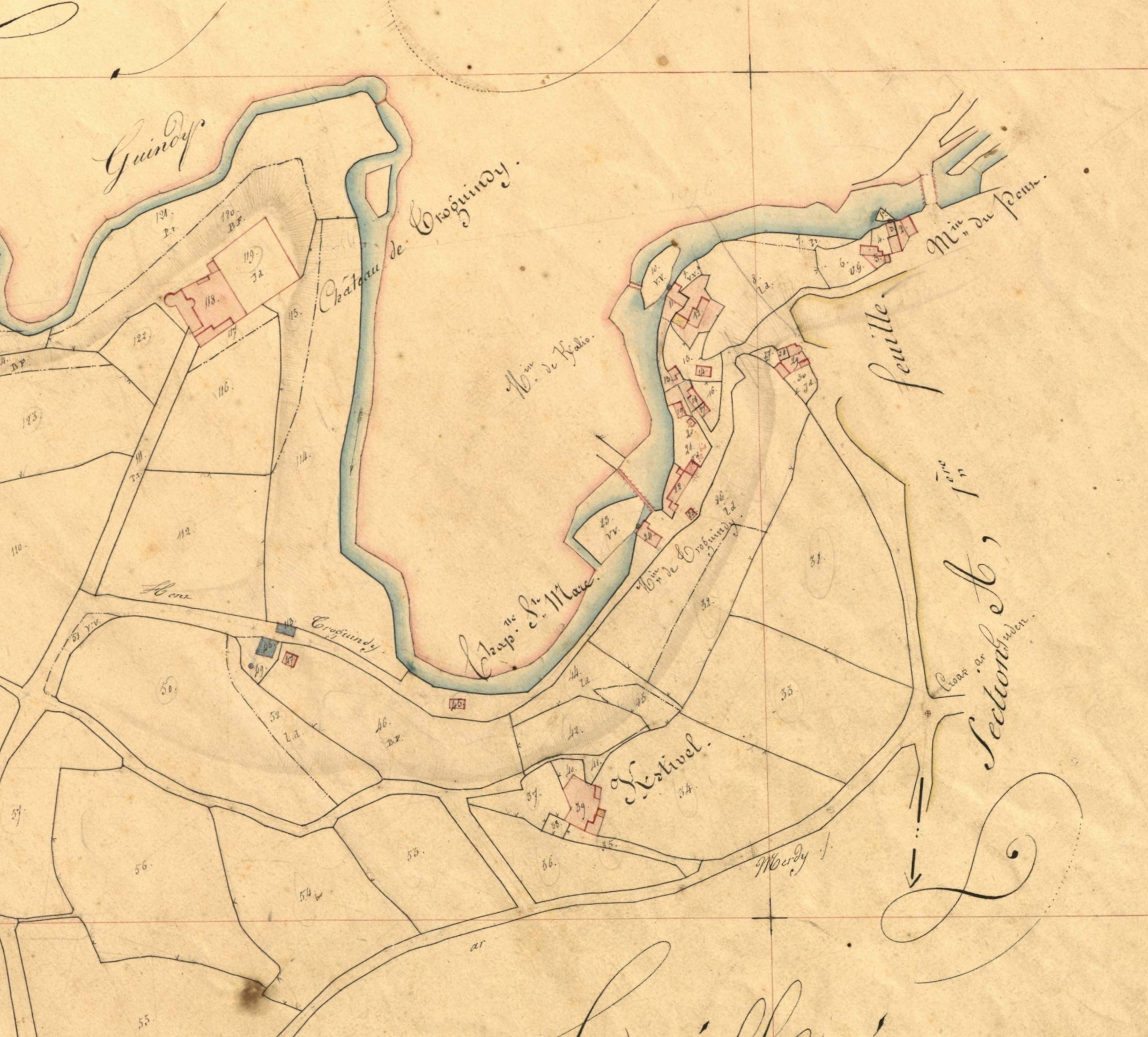 Extrait du cadastre ancien de Minihy-Tréguier, section B1 dite de Saint-Renault [sic], 1835 : manoir dit "château de Troguindy" ; "chapelle de Saint-Marc" ; village du Guindy et ses moulins à eauImmatriculation