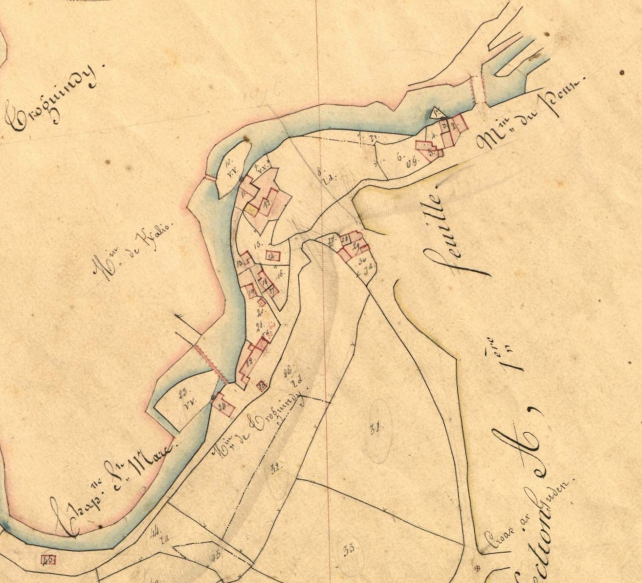 Extrait du cadastre ancien de Minihy-Tréguier, section B1 dite de Saint-Renault [sic], 1835 : "chapelle de Saint-Marc" ; village du Guindy et ses moulins à eauImmatriculation