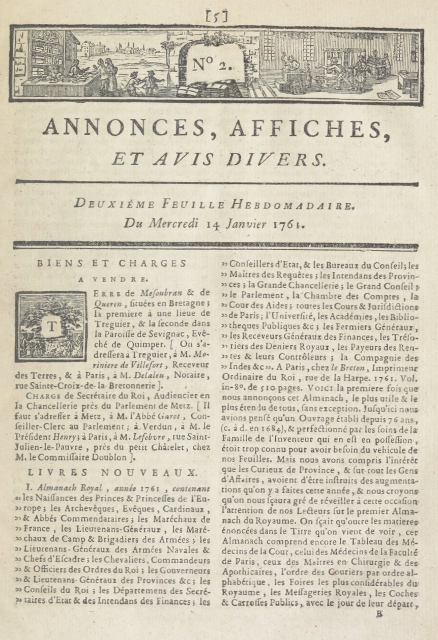Annonce de la vente de la terre de Mézaubran en 1761 dans "Annonces, affiches et avis divers", deuxième feuille hébdomadaire du mercredi 14 janvier 1761 (source : Bibliothèque Nationale de France)Immatriculation