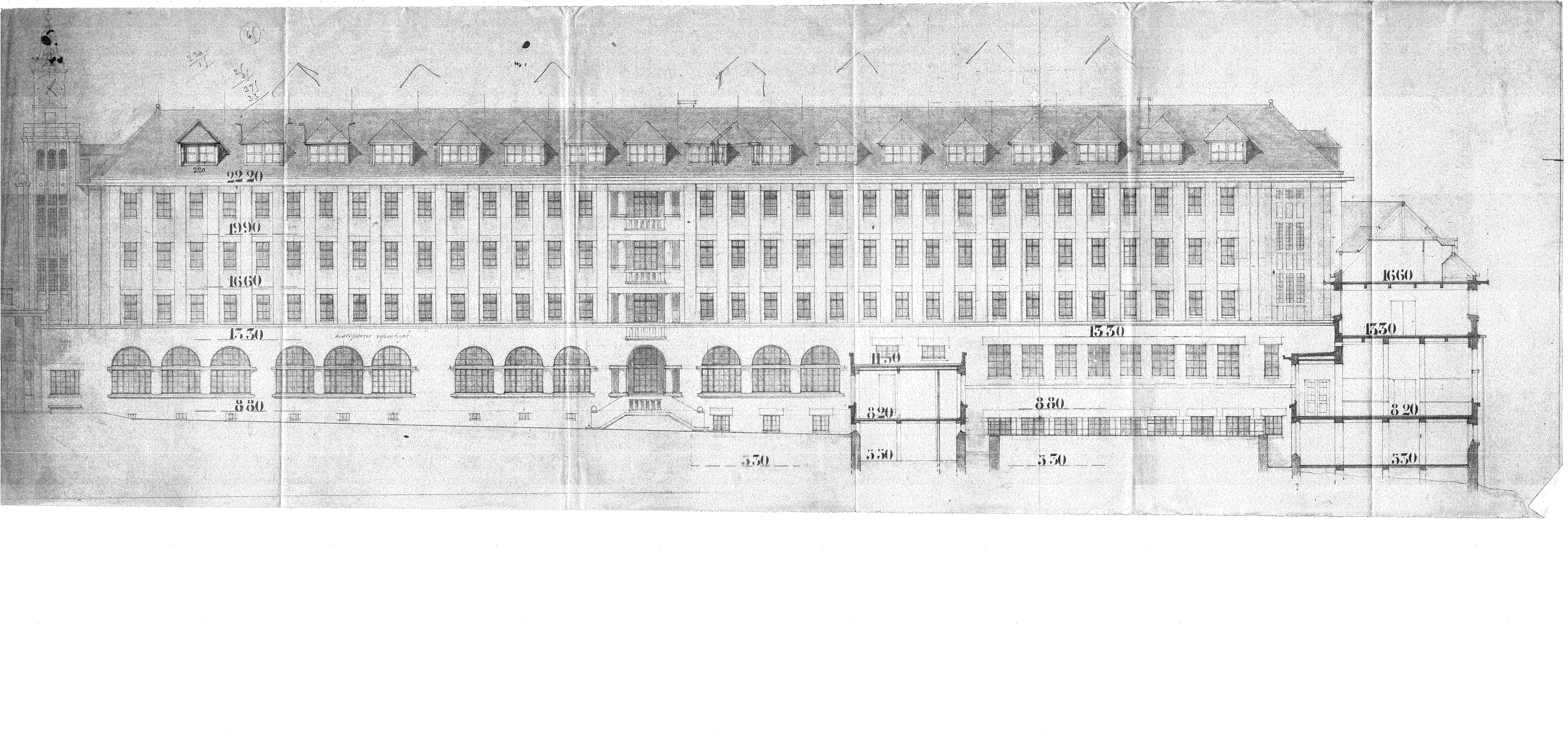Élévations des façades de la tour, de l'internat et coupe du réfectoire, G-R. Lefort, architecte, sd.Immatriculation