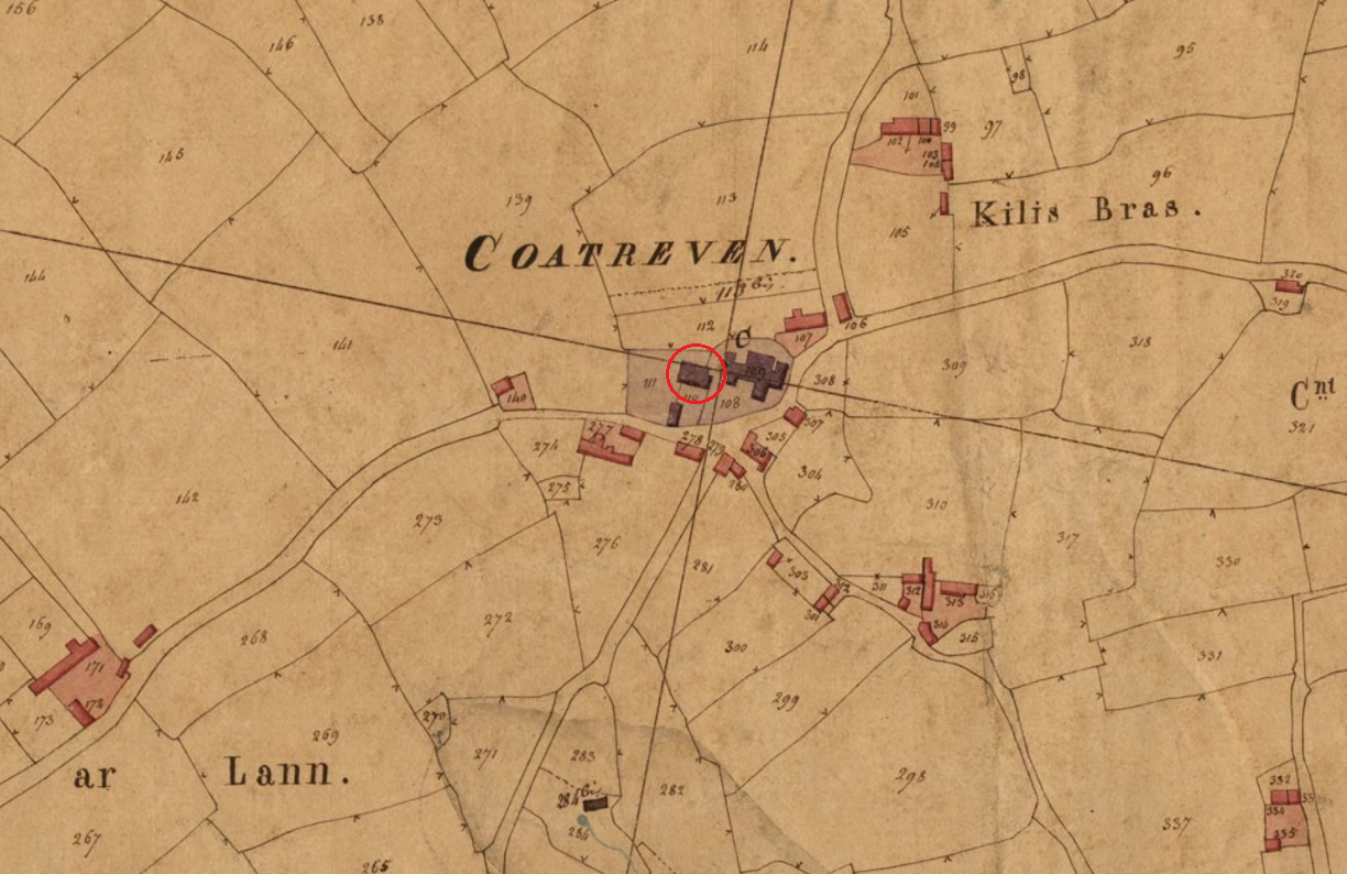 Extrait du cadastre ancien de la commune de Coatréven, Section A dite du Bourg, première feuille, 1834Immatriculation