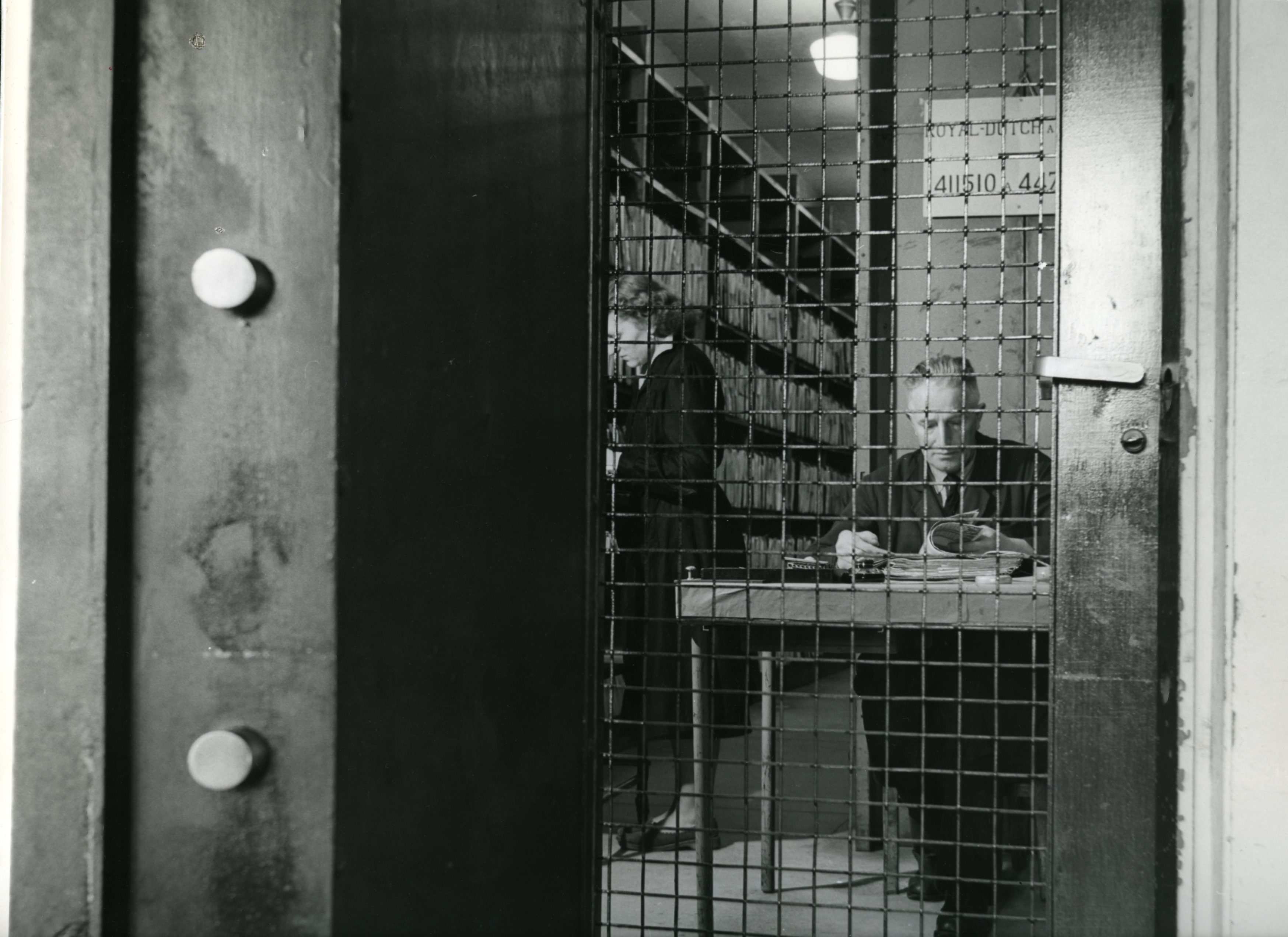 Aile arrière, rez-de-chausée, vue intérieure d'une salle des coffres, chambre forte, caisse Royal Dutch, photo vers 1945-1955Immatriculation