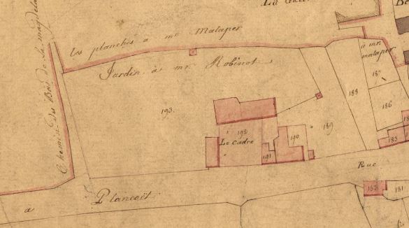 Extrait du cadastre ancien de 1827 représentant le manoir du Cadre et le jardin clos.Immatriculation