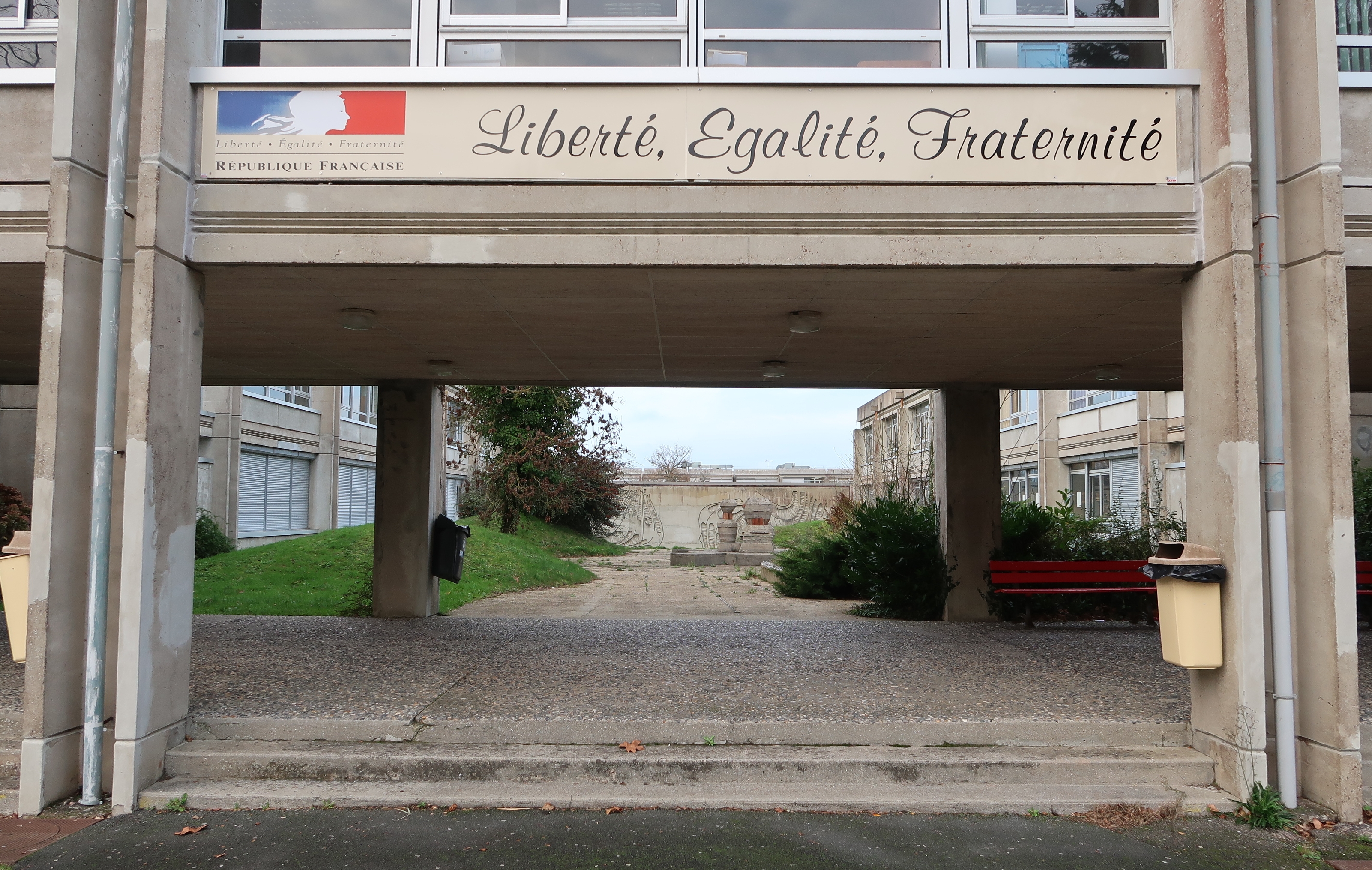 Une décoration totalement intégrée à l'architecture (vue à travers le préau). Bernard Alleaume et Yvette Vincent-Alleaume, 1974.Immatriculation