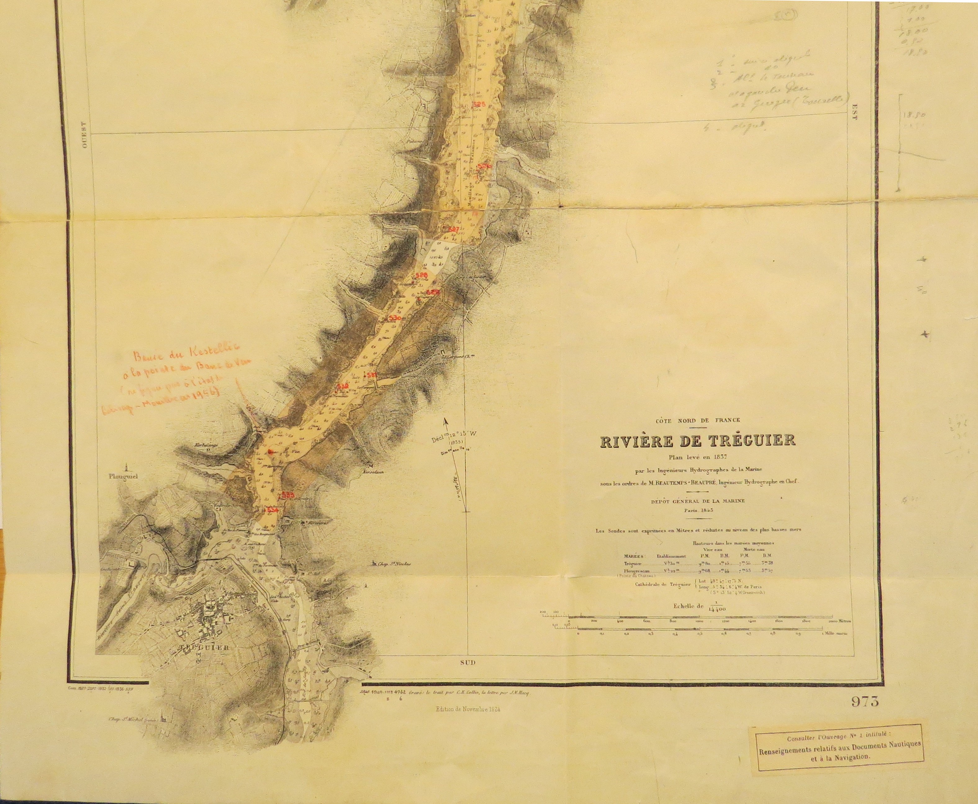 Carte de la rivière de Tréguier par Beautemps-Beaupré, 1837, annotée avec balisage numéroté des passes (circa 1956) (source : Archives Départementales des Côtes d'Armor, S supplément article 639)Immatriculation
