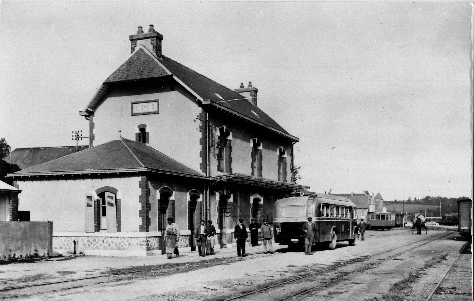 Gare de Tréguier, le nouveau bâtiment des voyageurs construit en 1928, l’autocar de la Compagnie des Chemins de Fer des Côtes-du-Nord est en place, déjà prêt à concurrencer le train... (collection réunie par Michel Le Hénaff)Immatriculation
