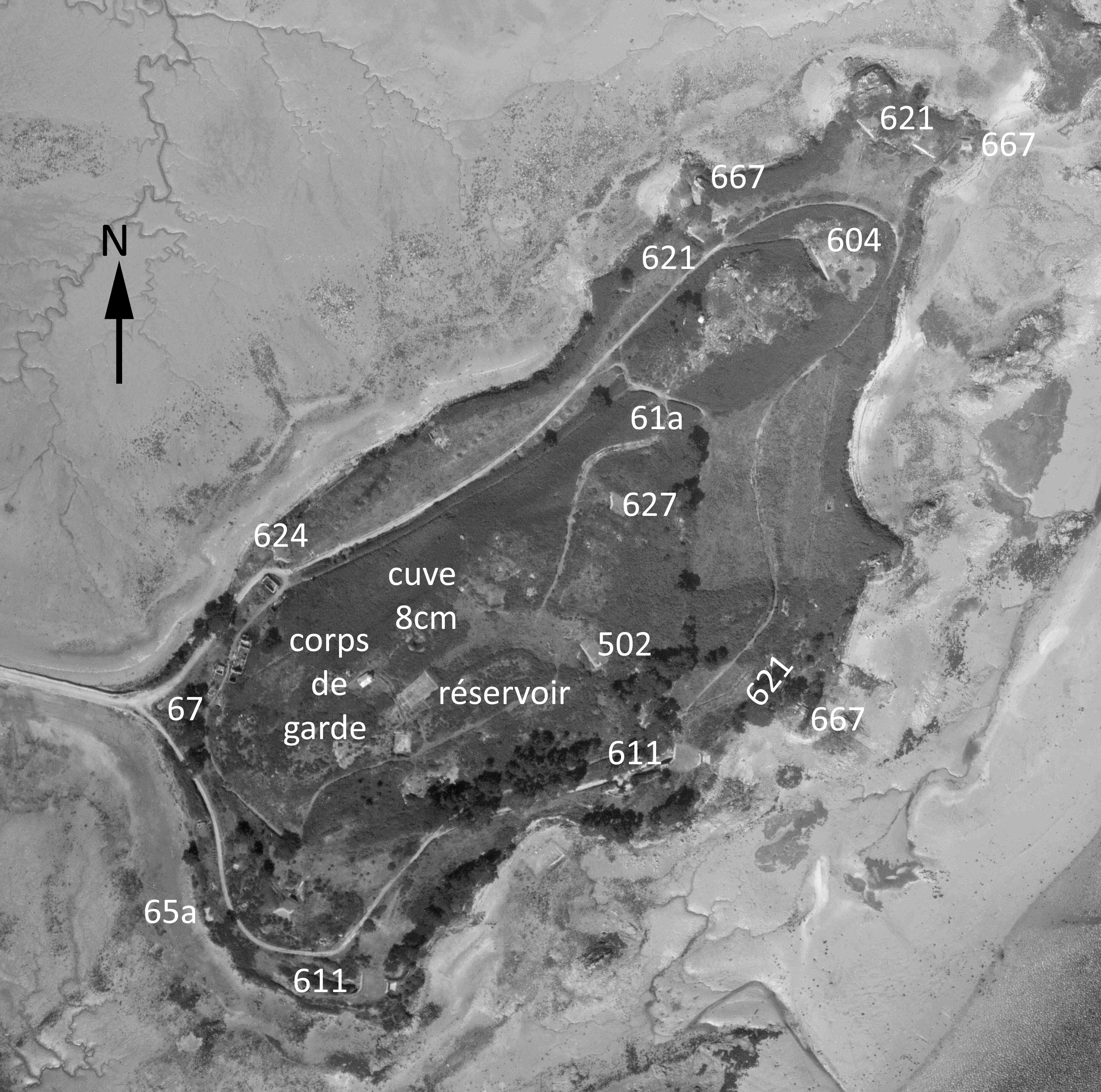 Vue aérienne verticale de l’île à Bois (source : Institut géographique national ; annotations : Alain Bohée)Immatriculation