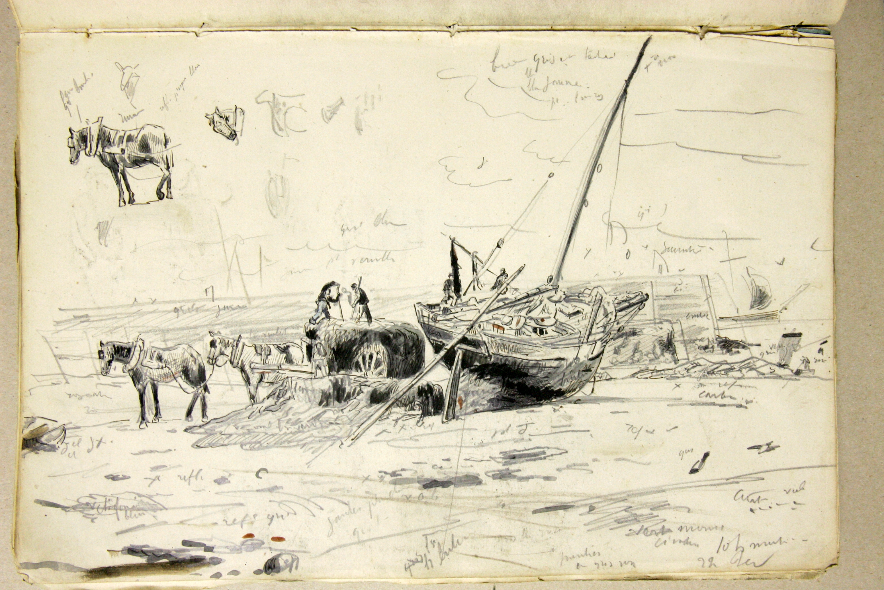 Echouage et déchargement avec attelage d’un sloop goémoniers au port de Lézardrieux, dessin FaudacqImmatriculation