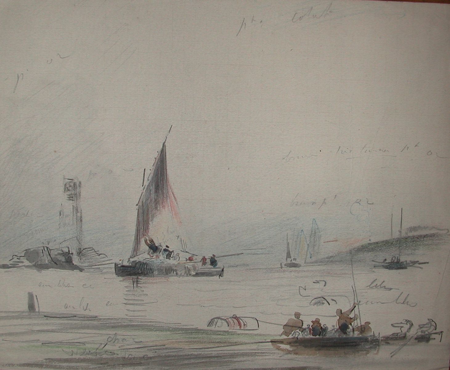 Bateaux goémoniers et sabliers devant le phare de la Corne et le banc de la Pie, dessin aquarellé (Faudacq)Immatriculation