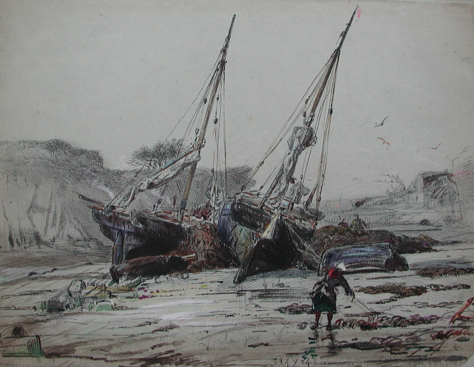 Dessin aquarellé : sloops goémoniers échoués dans une anse avec femmes au travail (Faudacq)Immatriculation