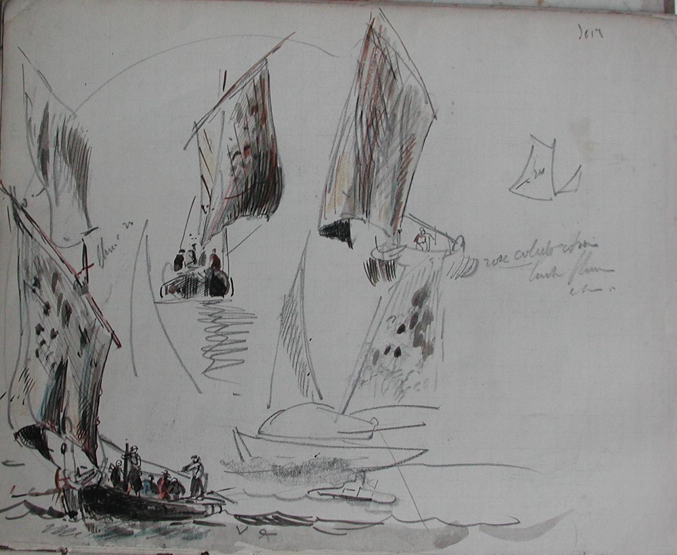 Dessin aquarellé : canot sabliers et goémoniers à cul pointu, gréés avec une misaine à la manoeuvre (Faudacq)Immatriculation