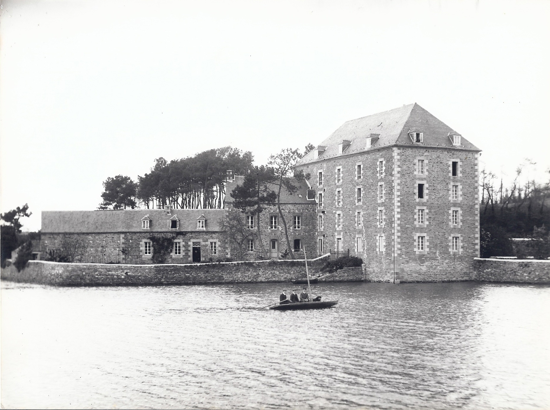 Vue du bâtiment côté sud par marée haute, en premier plan, trois hommes et un chien sur un frêle esquifImmatriculation