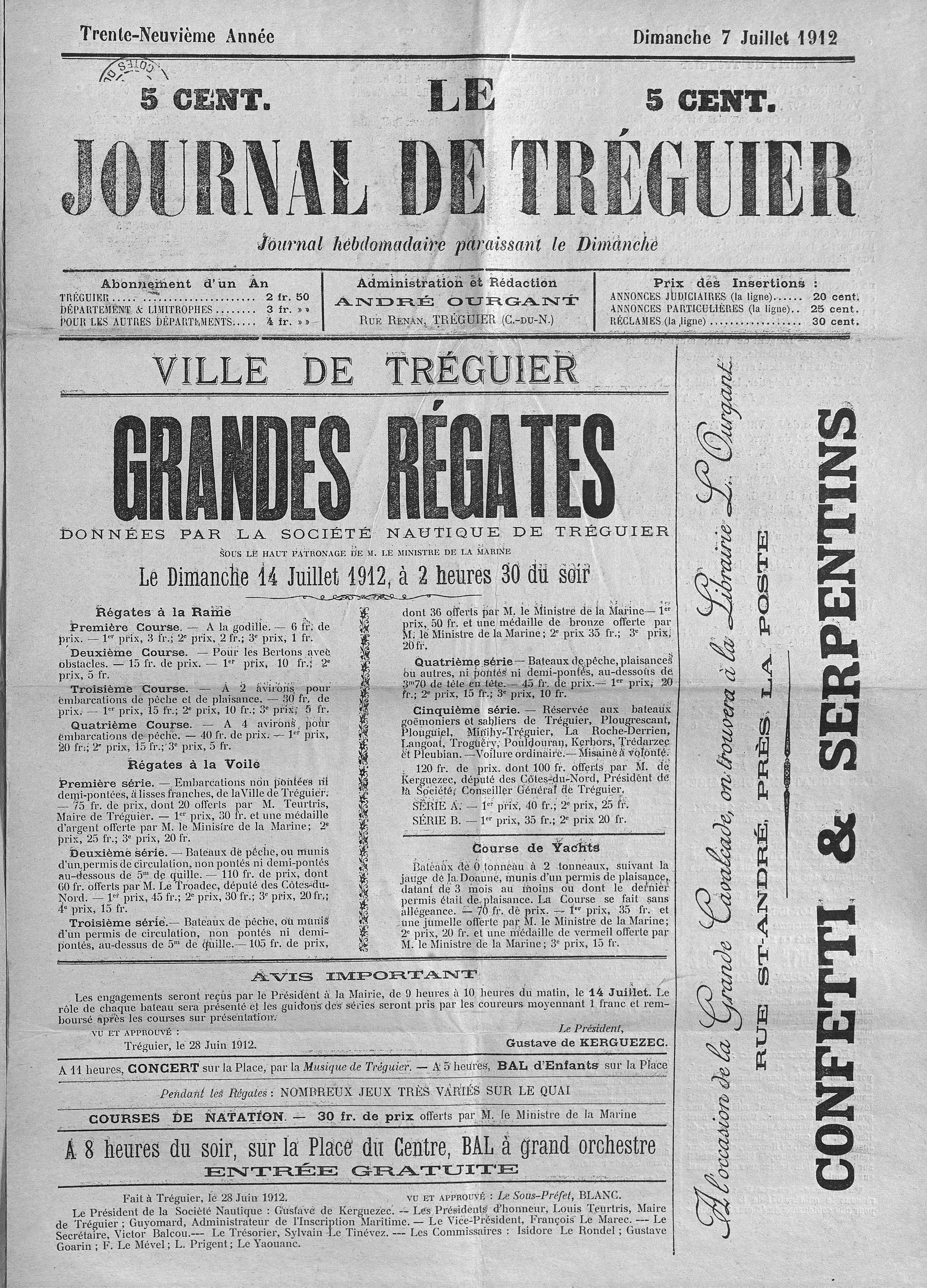 7 juillet 1912, Le journal de Tréguier annonce en première page des régates (Archives Départementales des Côtes-d’Armor, cote JP 54)Immatriculation