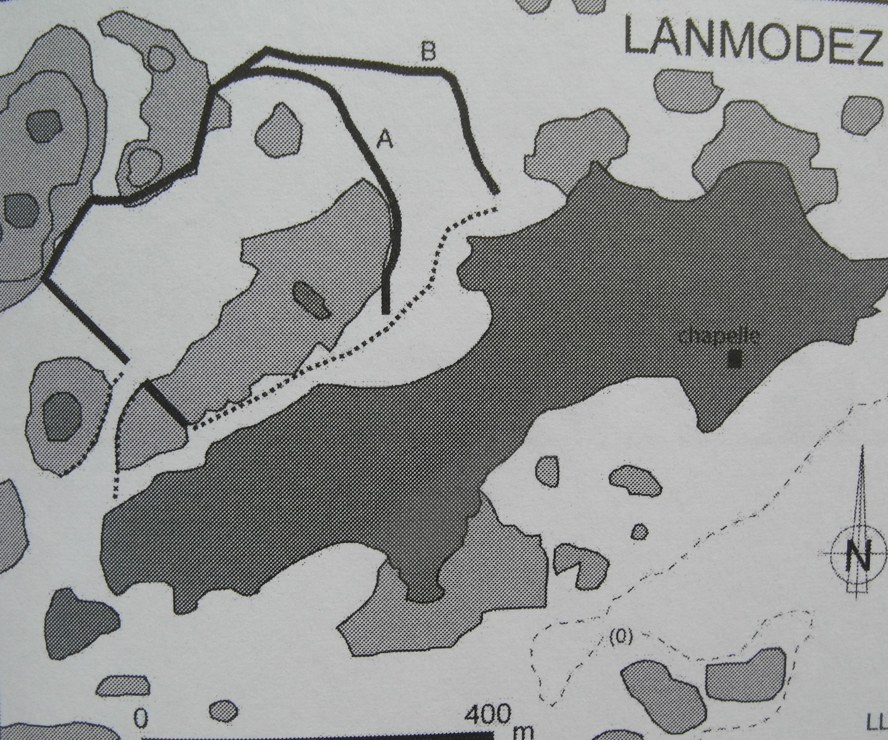 Grand parc en pierres de l’Île Maudez équipé de 2 barrages (pêcherie cadastrée), à côté de la chapelle de Maudez datée de 1240 (dessin : Loïc Langouët)Immatriculation