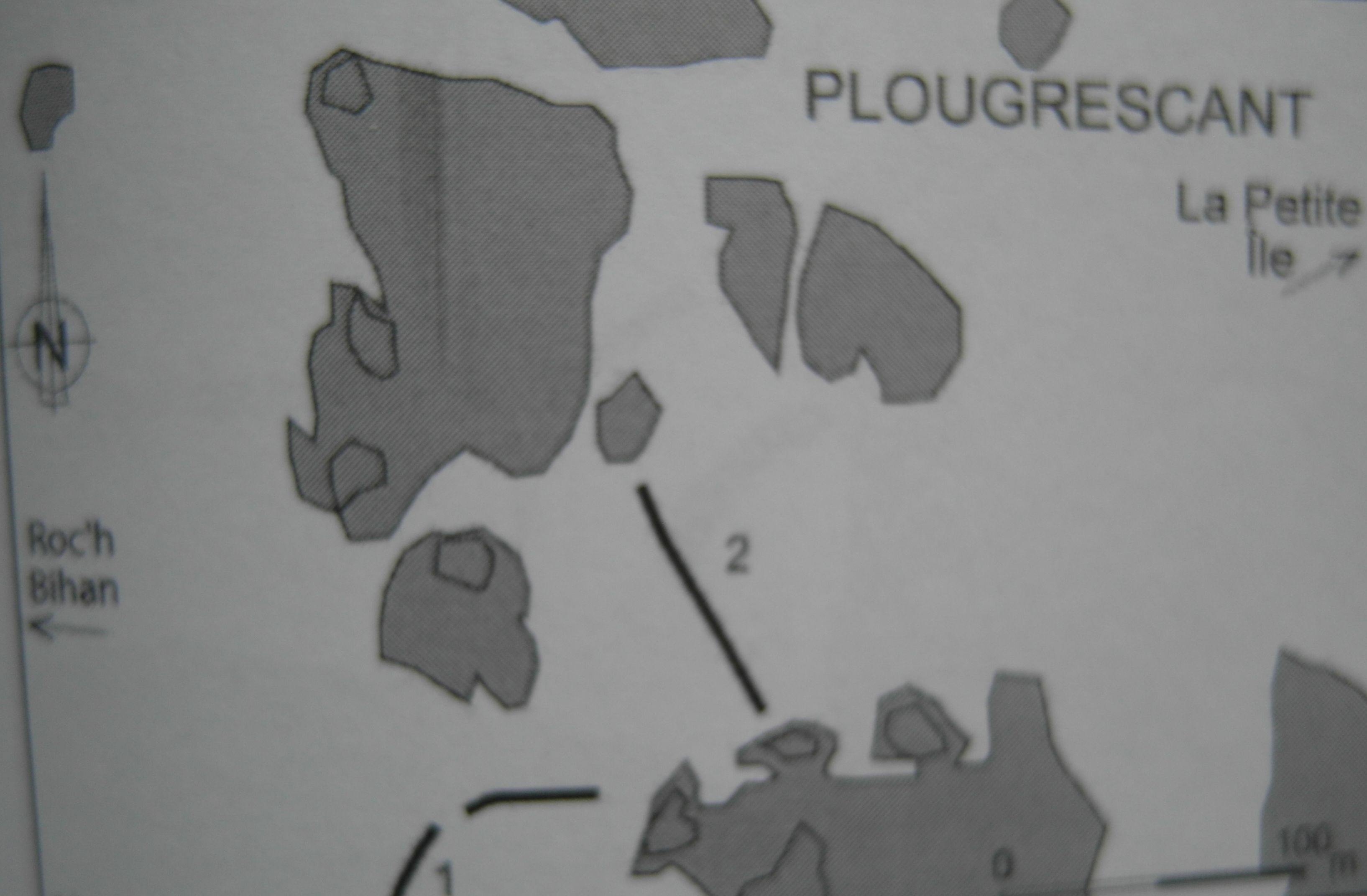 Barrages en pierres à l’est de Roc’h Bihan avec un pertuis central - Plougrescant (dessin : Loïc Langouët)Immatriculation